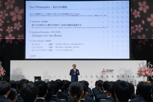 当社は4月1日付で新たな理念を制定した。将来を見据え、今を見つめ直し、私たち一人一人が何をすることが社会への貢献になるかということを考えて作成した。パーパスは会社の志。新入社員の皆さんも自分自身のパーパスを持って日々取り組んでほしい。リスクを恐れず新たな発想で価値を創出するイノベーティブカンパニーへの変革を目指しており、安定的に利益を生み出し、持続的な成長をしていくためには、事業構造の変革が必要だ。皆さんも事業を強くするために何をすべきかを常に考え、アイデアを生かし、これからの三菱電機をつくる原動力になってほしい。