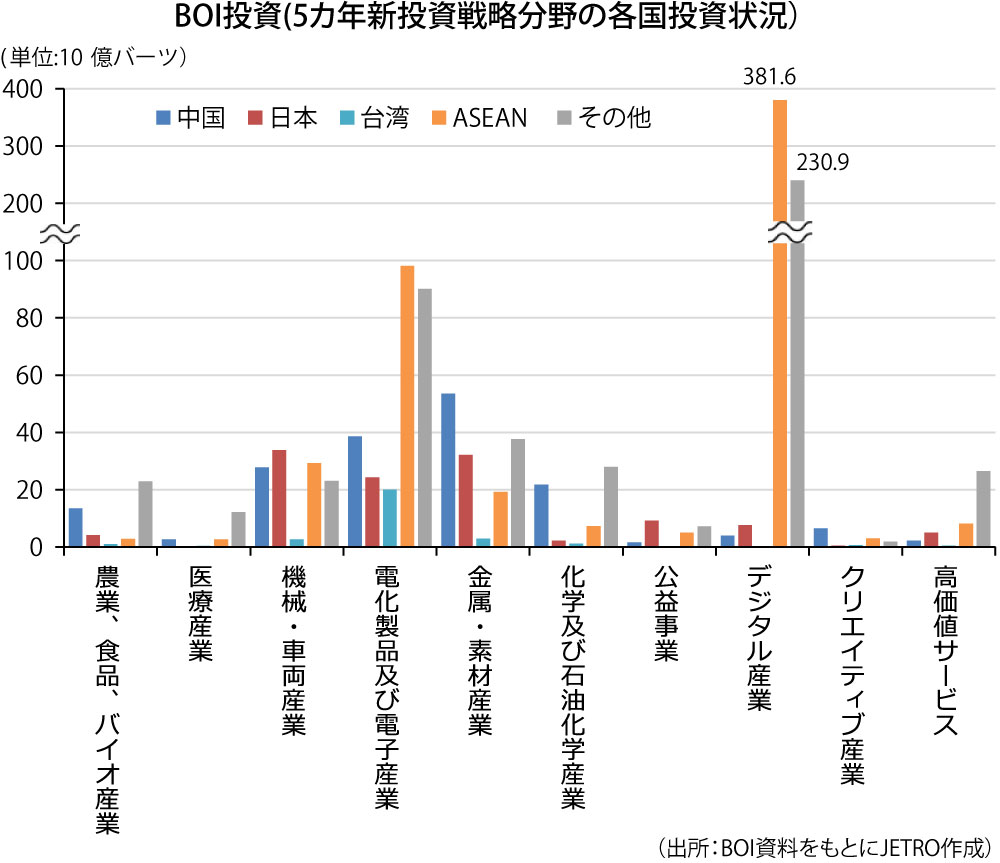 Thiland4.0では、①次世代自動車②スマートエレクトロニクス③メディカル&ウェルネスツーリズム④農業・バイオテクノロジー⑤食品関連⑥ロボティクス⑦航空⑧バイオ燃料・バイオ科学⑨デジタル⑩メディカルハブ⑪防衛⑫教育・人材開発――という12の重点産業への投資拡大を目指している。この取り組みを加速させるため、タイ政府はチョンブリ、ラヨーン、チャチューンサオの東部3県に「東部経済回廊(EEC:Eastern Economic Corridor)」を設置し、重点産業の誘致を積極的に推し進めている。