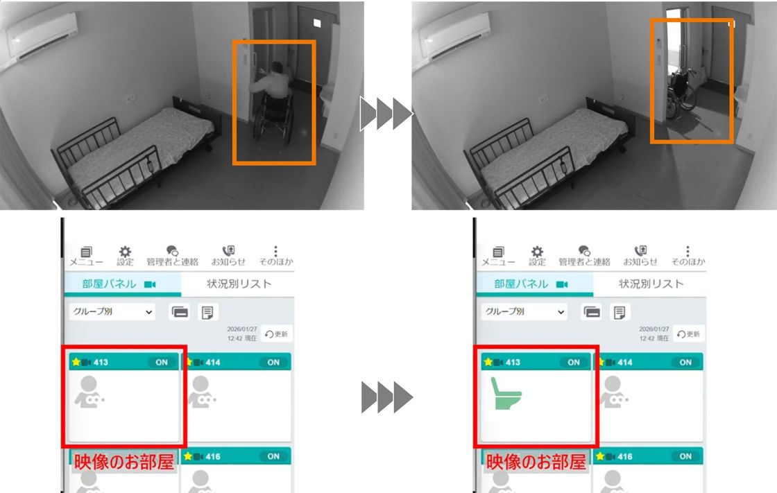 AIセンシングカメラがトイレの出入りを判別し、スタッフルームの閲覧画面上に専用アイコンとして表示する。スタッフは訪室前に状況を把握でき、必要なタイミングのみ訪室できるようになる。介助の最適なタイミングについて判断できるほか、不要な訪室の抑制をよりシンプルに実現できる。
