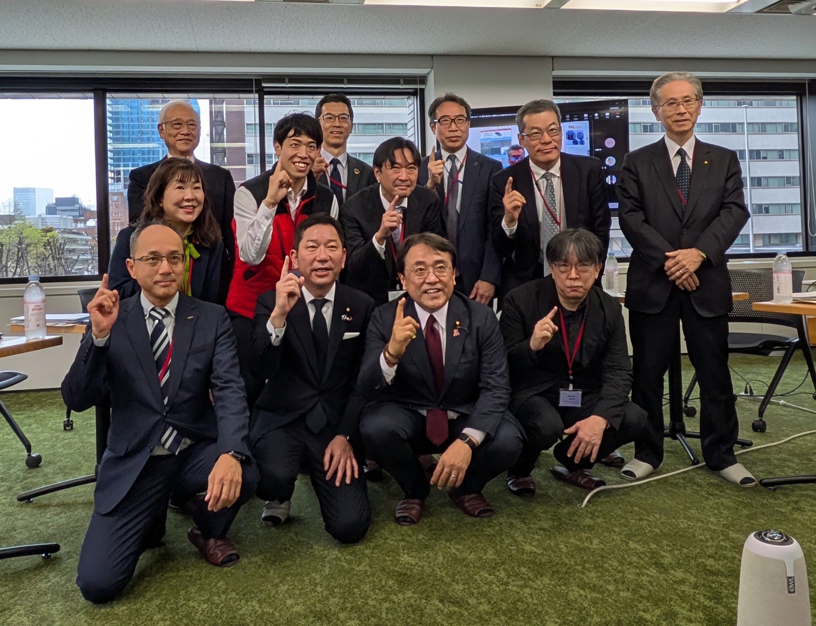 戦略的投資イニシアティブに関する車座の会場で、参加者たちと記念撮影する赤澤経産相(前列の右から2人目)=東京都千代田区