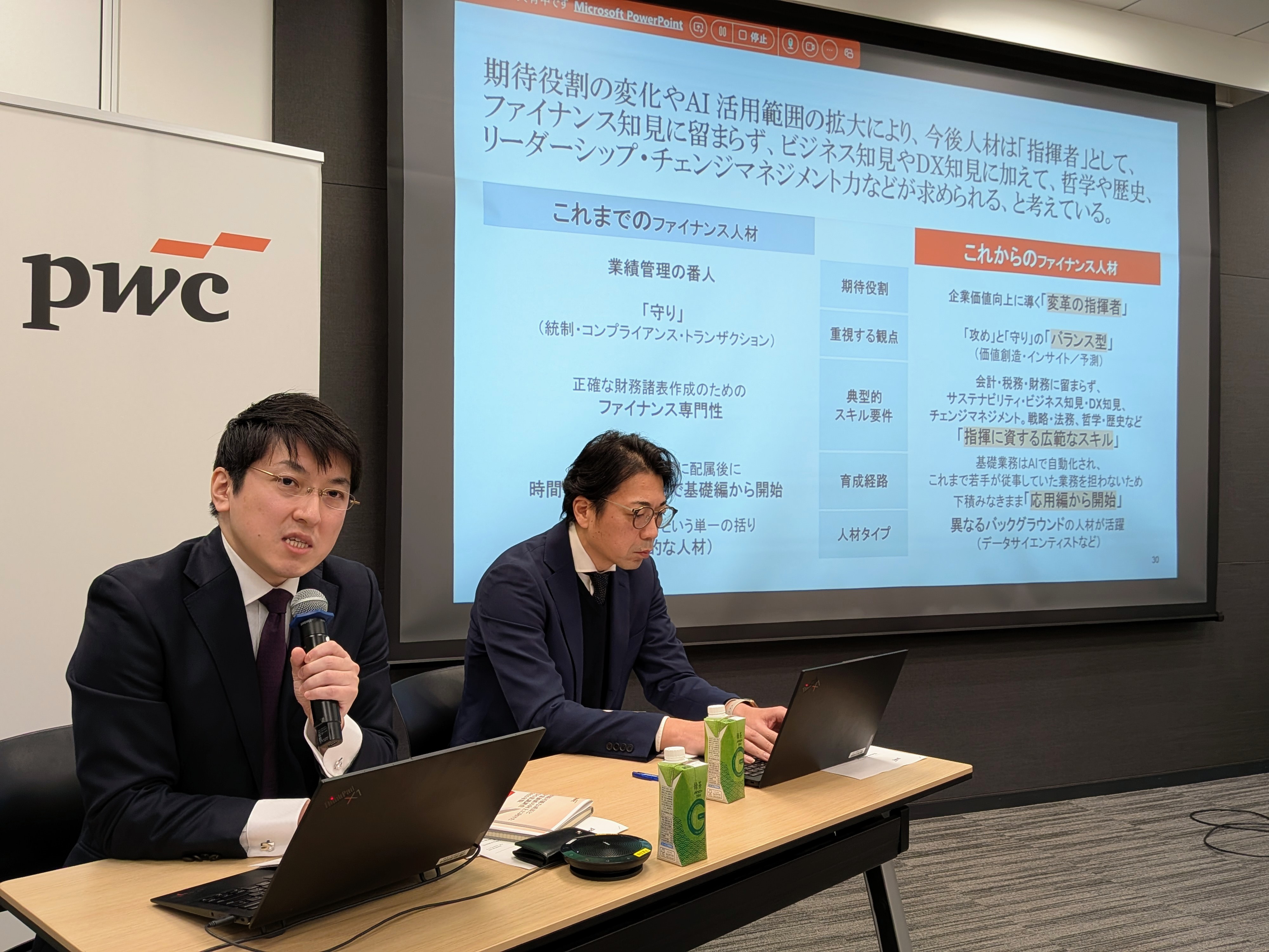 CFO意識調査の結果を説明するPwCコンサルティングの小林たくみパートナー(左)ら=東京都千代田区