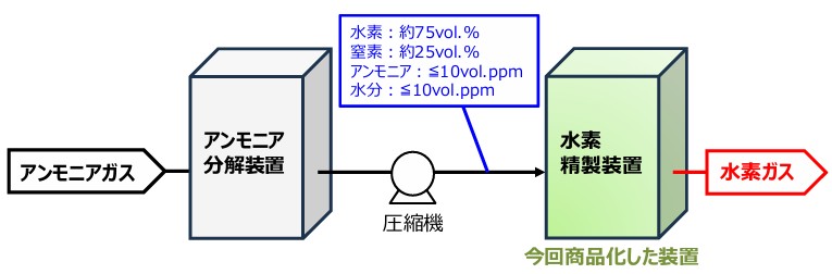 日本酸素は、カーボンニュートラルの実現に貢献可能なアンモニア分解ガスから水素ガスを精製する装置を今月から販売開始した。