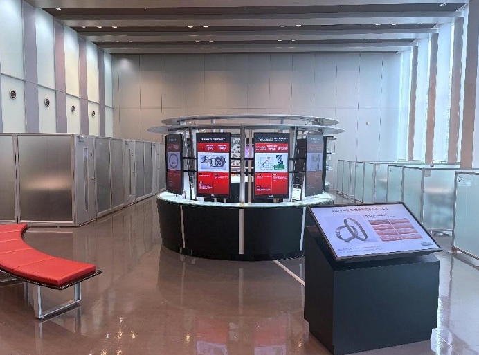設備面では、従来の円形サークル什器に加え、新たにタッチモニター1台と映像モニター8台を設置する。あわせて商談・打ち合わせスペースも刷新し、利便性と快適性を高める。