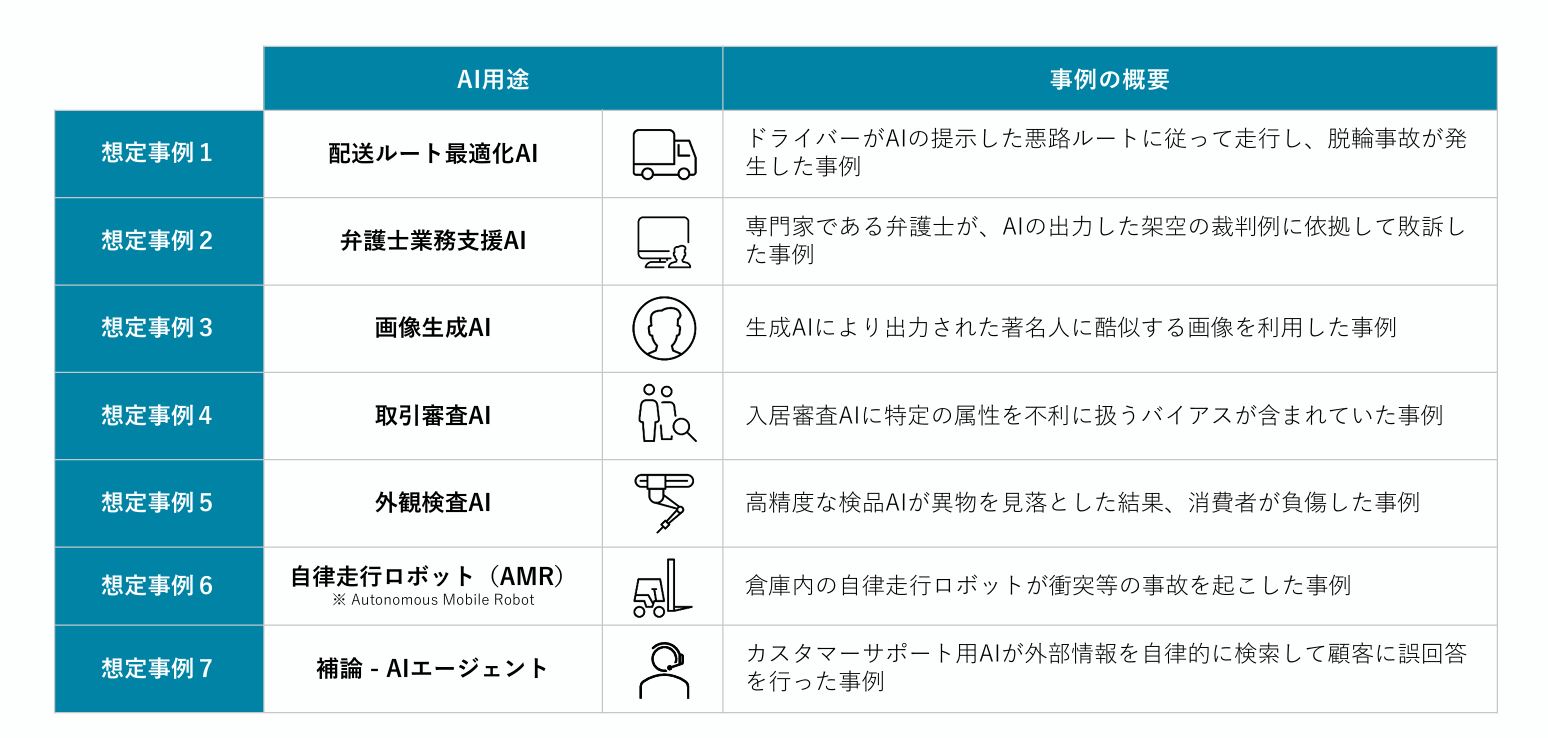 AIに関するトラブルの想定事例の一覧 (出所:経済産業省が公表した「AI利活用における民事責任の解釈適用に関する手引き」の概要資料より引用)