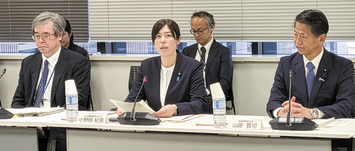 「AI・半導体ワーキンググループ」の会合であいさつする小野田AI戦略担当相(中央)と経産省の山田副大臣(右)=東京都千代田区