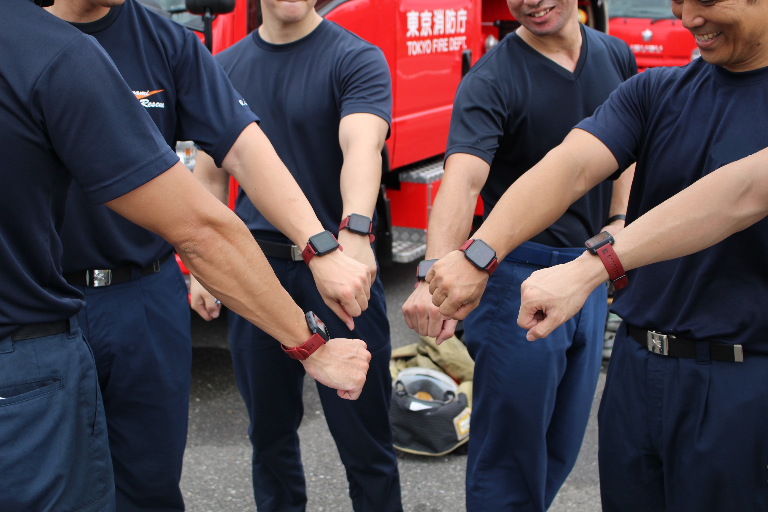 東芝のリストバンド型センサーを装着した東京消防庁の消防隊員