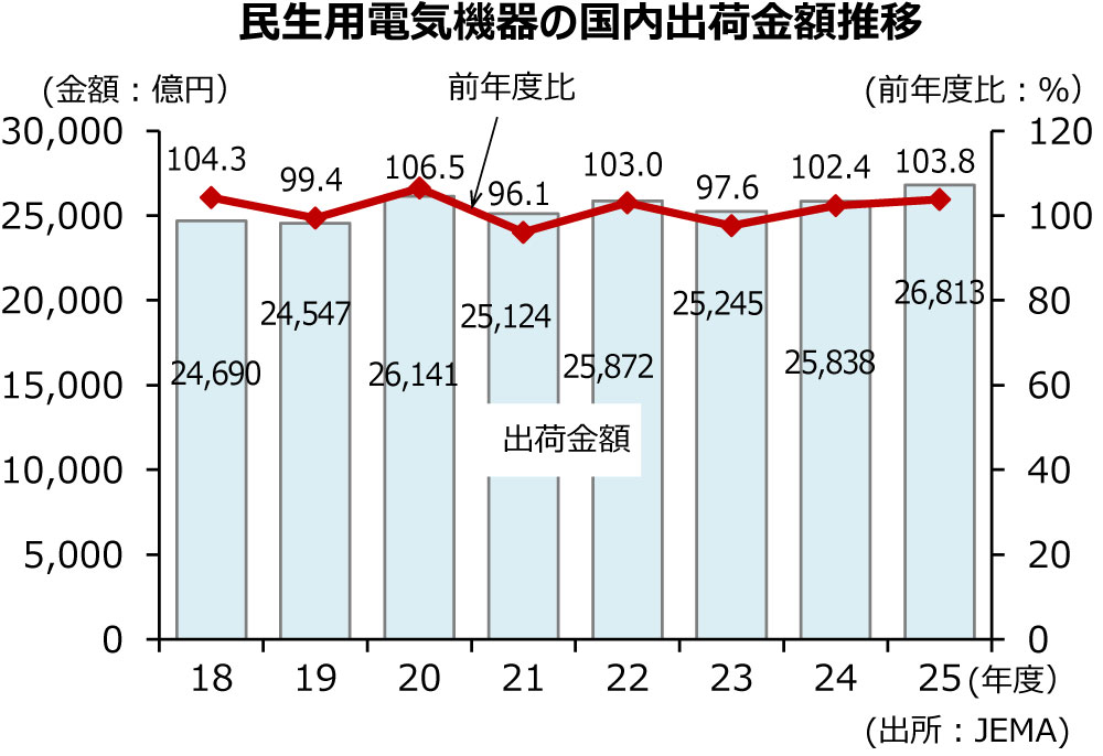 日本電機工業会(JEMA)が20日発表した2025年度(25年4月~26年3月)の白物家電の国内出荷金額は、前年度比3.8%増の2兆6813億円で2年連続のプラスとなった。ルームエアコンが全体をけん引し、1991年度に次ぐ過去2番目の出荷金額となった。