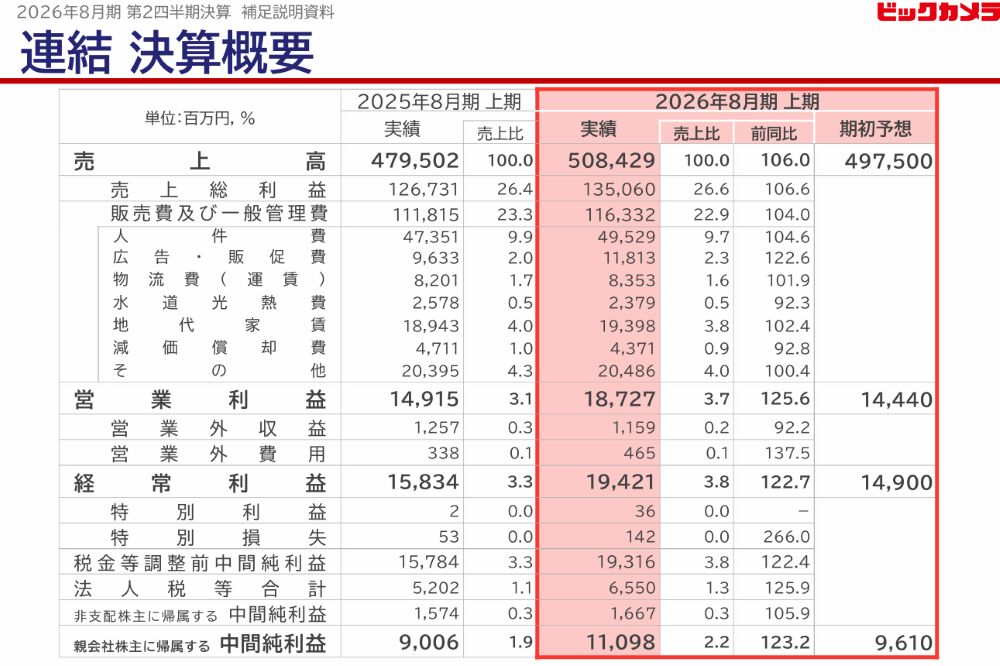ビックカメラの2026年8月期第2四半期(25年9月~26年2月)の連結決算は、売上高が前年同期比6.0%増の5084億2900万円、営業利益が同25.6%増の187億2700万円と増収増益だった。経常利益は同22.7%増の194億2100万円、純利益は同23.2%増の110億9800万円となり、すべての項目で過去最高を達成した。