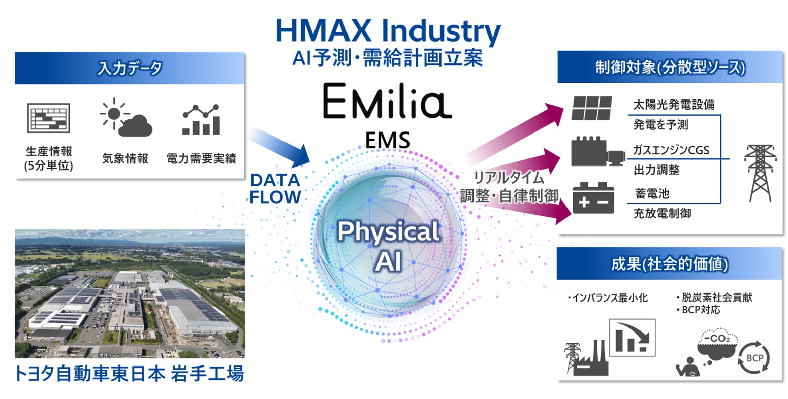 日立製作所は、トヨタ自動車東日本の岩手工場(岩手県金ケ崎町)にエネルギー管理システム(EMS)「EMilia(エミリア)」を納入し、4月に稼働を始めたと発表した。日立は、現実世界を認識し自律的に判断・行動する「フィジカルAI(人工知能)」で高精度に電力需要を予測する仕組みを実現し、再生可能エネルギーの活用を支援する。