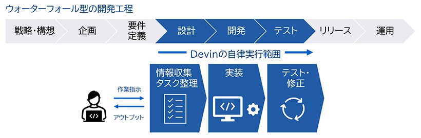 日本企業の開発現場では、IT技術者不足が深刻化し、IT戦略の立案や新規ビジネスの検証(PoC=概念実証)など、成長に直結する業務に十分な時間を割きにくい状況が続く。従来の開発支援AIは、ソースコードの補完や部分的なプログラム生成にとどまる例が多く、設計、実装、テスト、不具合の特定と修正は人手に頼る場面が多かった。