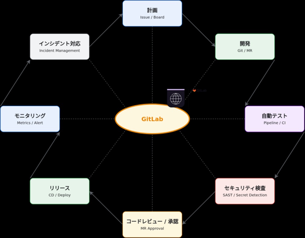 新サービスの中核を担うのが、ソフトウエア開発のライフサイクル全体をカバーする統合プラットフォーム「GitLab」だ。この基盤を活用し、開発から運用までのプロセスを統合・自動化することで、ソフトの開発と運用を一体化させる手法「DevOps」の導入から定着までを一貫支援する。