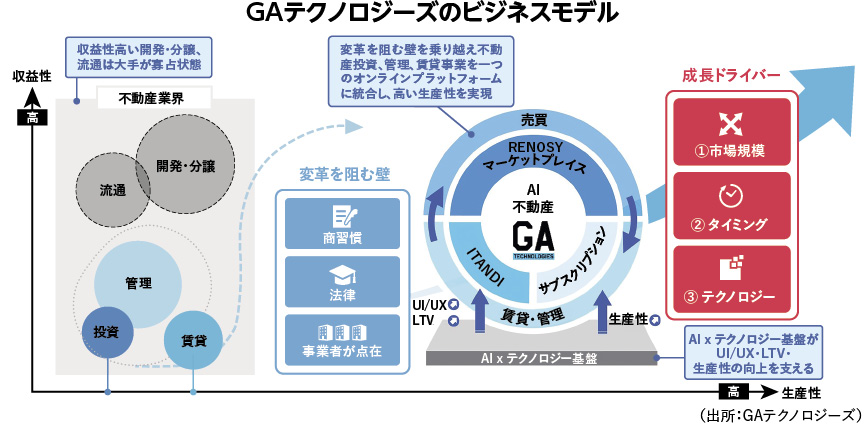 不動産テック事業を手掛けるGAテクノロジーズは、不動産投資サービス「RENOSY(リノシー)」を軸に、不動産取引のデジタル化とデータ活用を加速させている。物件の仕入れから販売、管理までを一気通貫で手掛け、購入後の運用実績まで蓄積する仕組みを確立した。属人的になりがちな不動産投資の不透明さを、テクノロジーと人による対話で解消し、個人の資産形成手段としての定着を狙う。