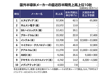 エヌビディア断トツ首位 AI・DC需要追い風、外国半導体企業、直近四半期の売上額上位10社
