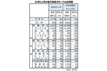 電子部品グローバル出荷25年11月度、3カ月連続で前年同月比プラスに AI関連などが需要をけん...