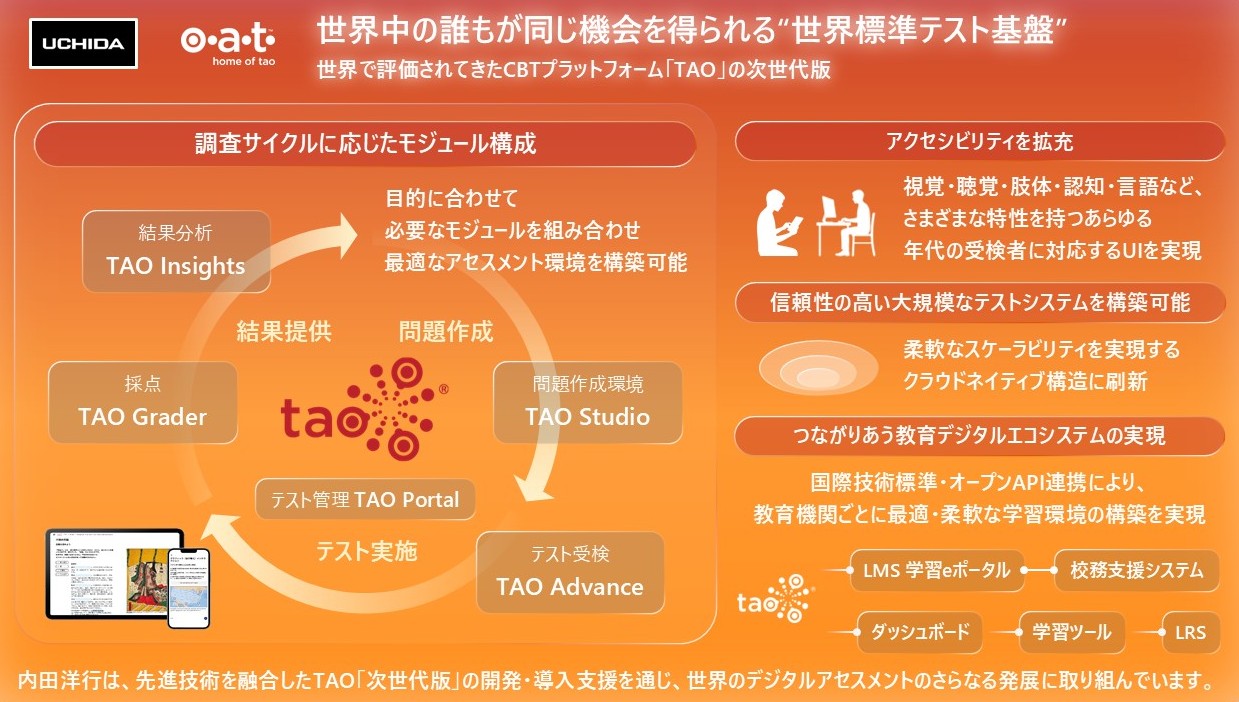 TAOは、ポータルサイトから、テスト、問題作成環境、採点、結果分析などの各モジュールで構成され、利用者に合わせ自由に組み合わせて環境が構築できる。国内では、専用のシステムを構築せずに必要に応じて柔軟に利用できる「TAOエンタープライズ(SaaS=Software as a Service)」を発売した。年間利用で約60万円(税別、テスト回数約2400回)からとなる。