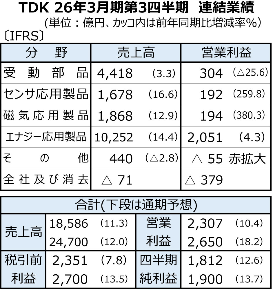 TDKの25年4~12月期、売り上げ・各利益とも過去最高更新 通期予想を上方修正