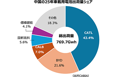 25年の中国車載電池市場、CATLがシェア43%でトップ26/01/20